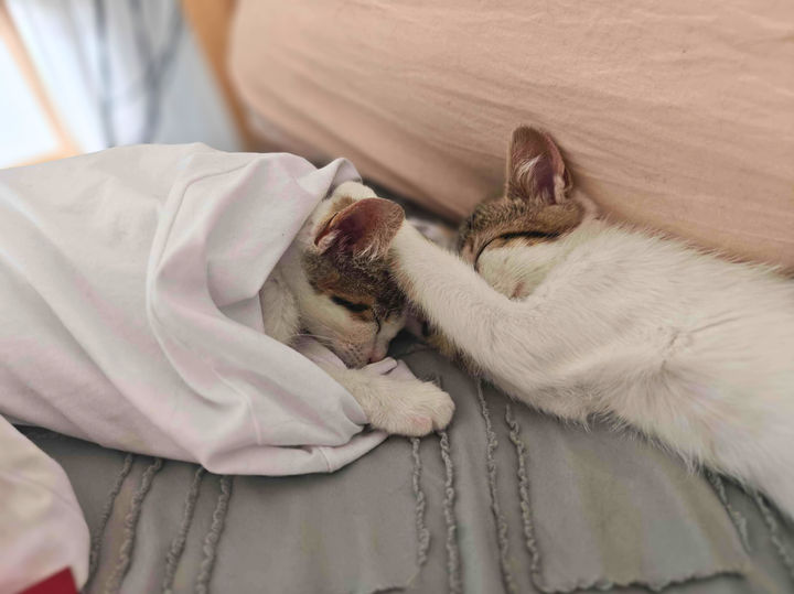 Azur, c’est l’audacieux, le joueur, celui qui explore pendant que son frère observe. Il adore courir après son jouet préféré, une perche avec un grelot et des plumes, qu’il traque avec une énergie joyeuse. Et une fois ses grandes explorations et parties de jeu terminées, il s’installe pour une sieste bien méritée, tout calme, tout doux. C’est dans ces moments-là qu’il se laisse pleinement caresser, les yeux mi-clos, et qu’il nous offre toute la tendresse qu’il a en lui.